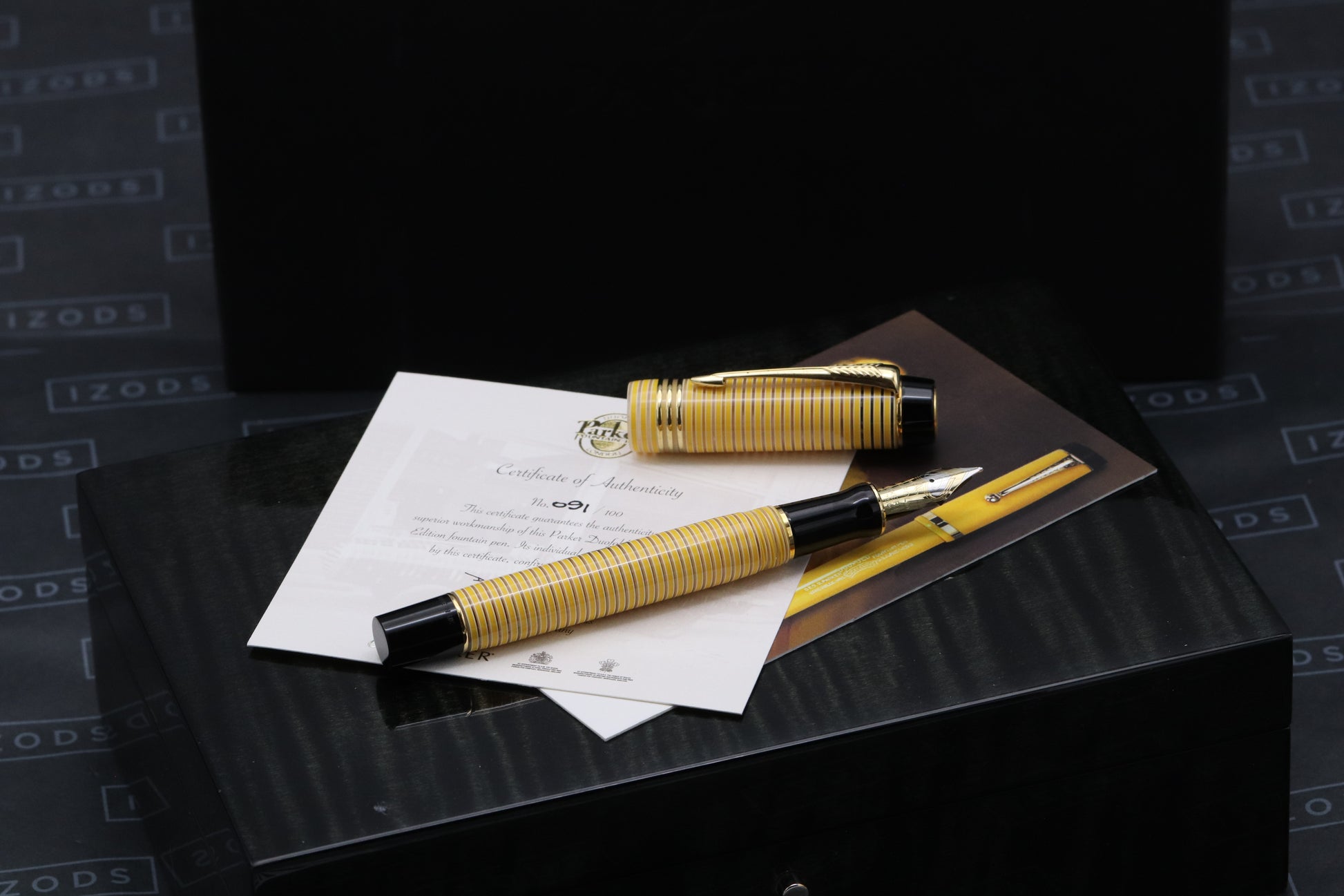 Thanks very much for looking at our listing for this extremely rare Parker Duofold Centennial 'Bumblebee' Limited Edition Fountain Pen, which comes with its lacquered Parker presentation box (including outer), blotter card and certificate. The pen has never been used and is presented in wonderful - there are a few very small spots on the gold-plated clip and the edges of the cap top finial, but this is a minor point and the photos show them under extreme magnification.