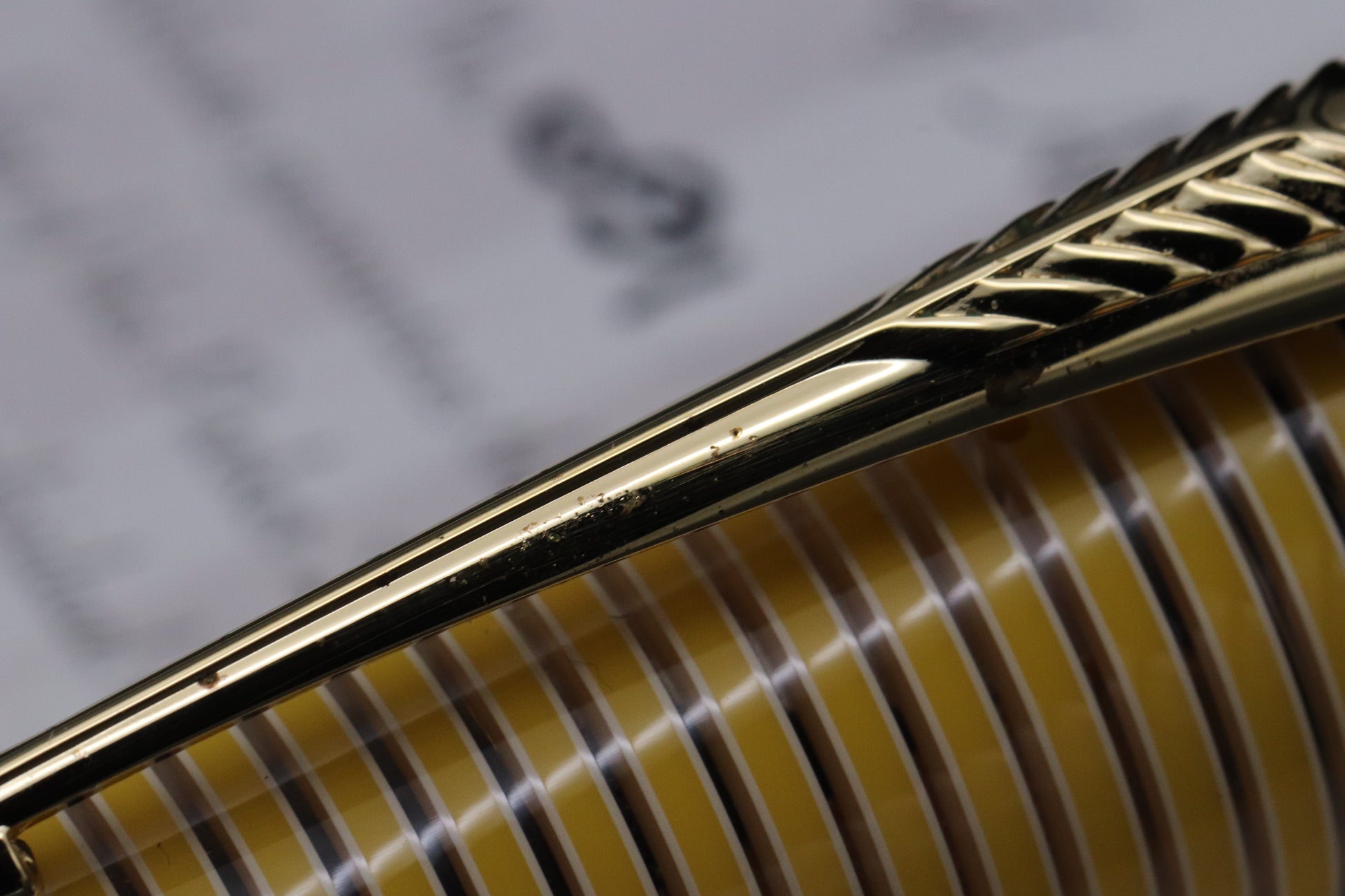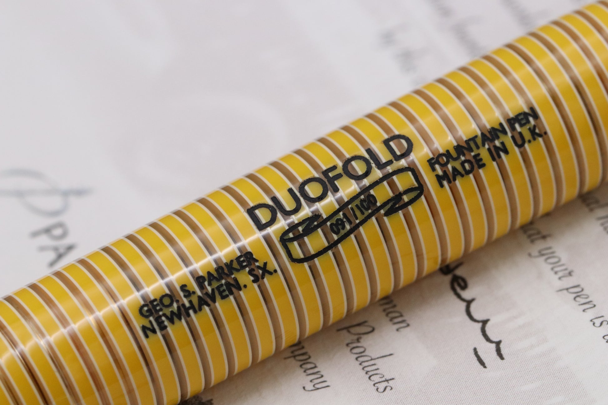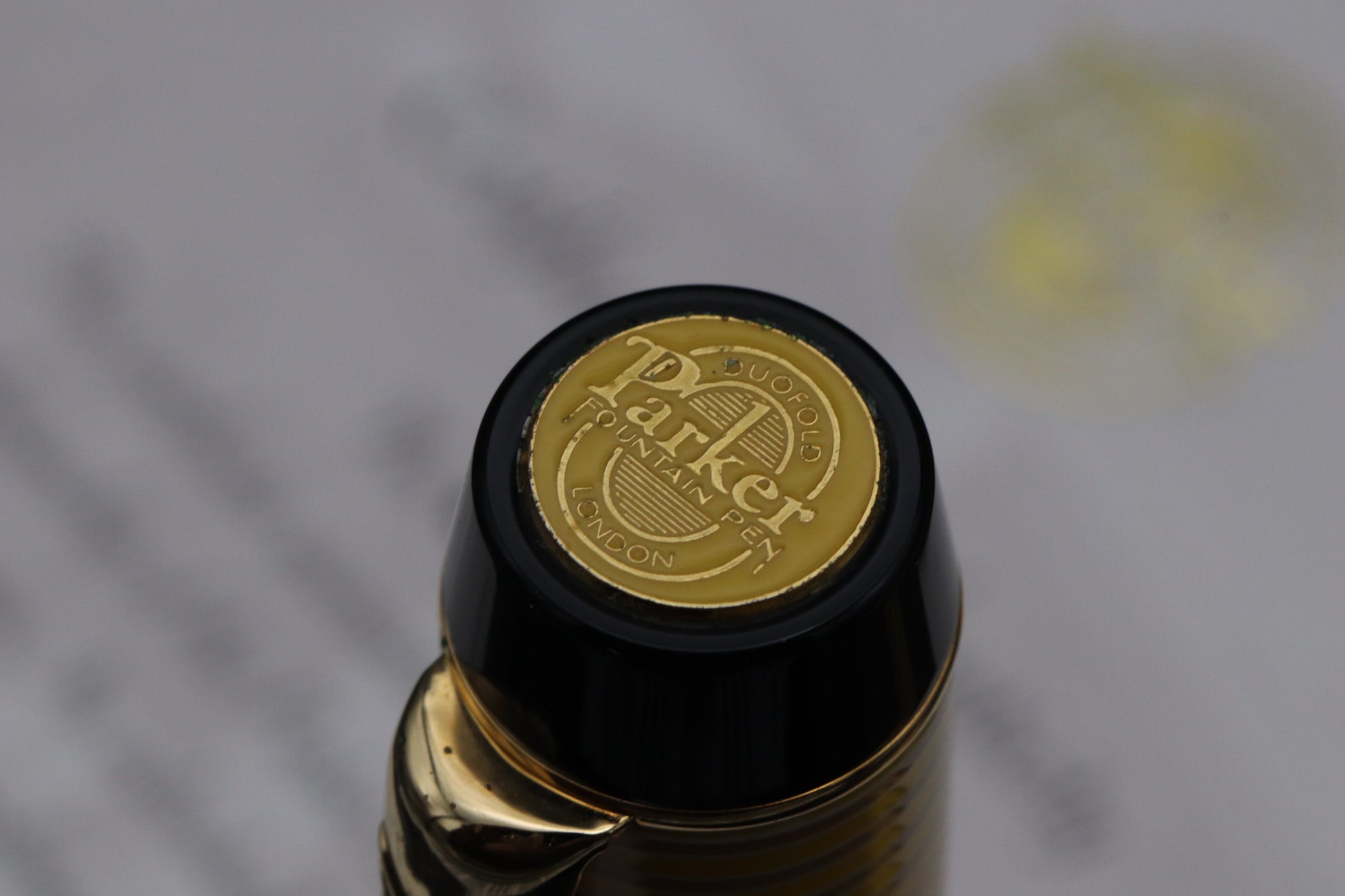 Originally released in 2007 as a limited edition for the London Pen Show - of the 100 only 87 were made available, as Parker retained 13 (this is number 91). It was technically known as the London Parker Duofold (as per the cap decal), but due to its fascinating striped design, it has become known as the 'Bumblebee'. The inspiration for the design comes from the laminated Parker Vacumatic from the 1930s. The cap and barrel use the same laminated design, with yellow rings with white borders, alternating with transparent rings. The trim is gold-plated. The classic Parker banner is engraved on the barrel and includes the limitation number.