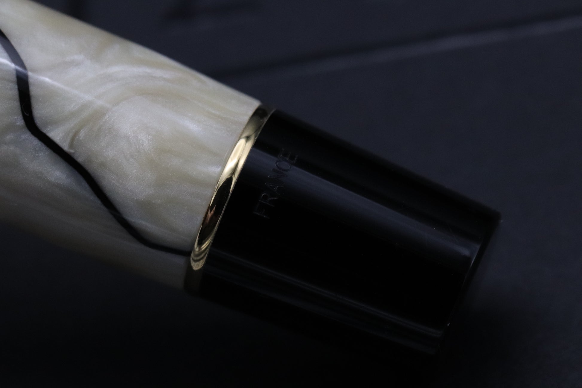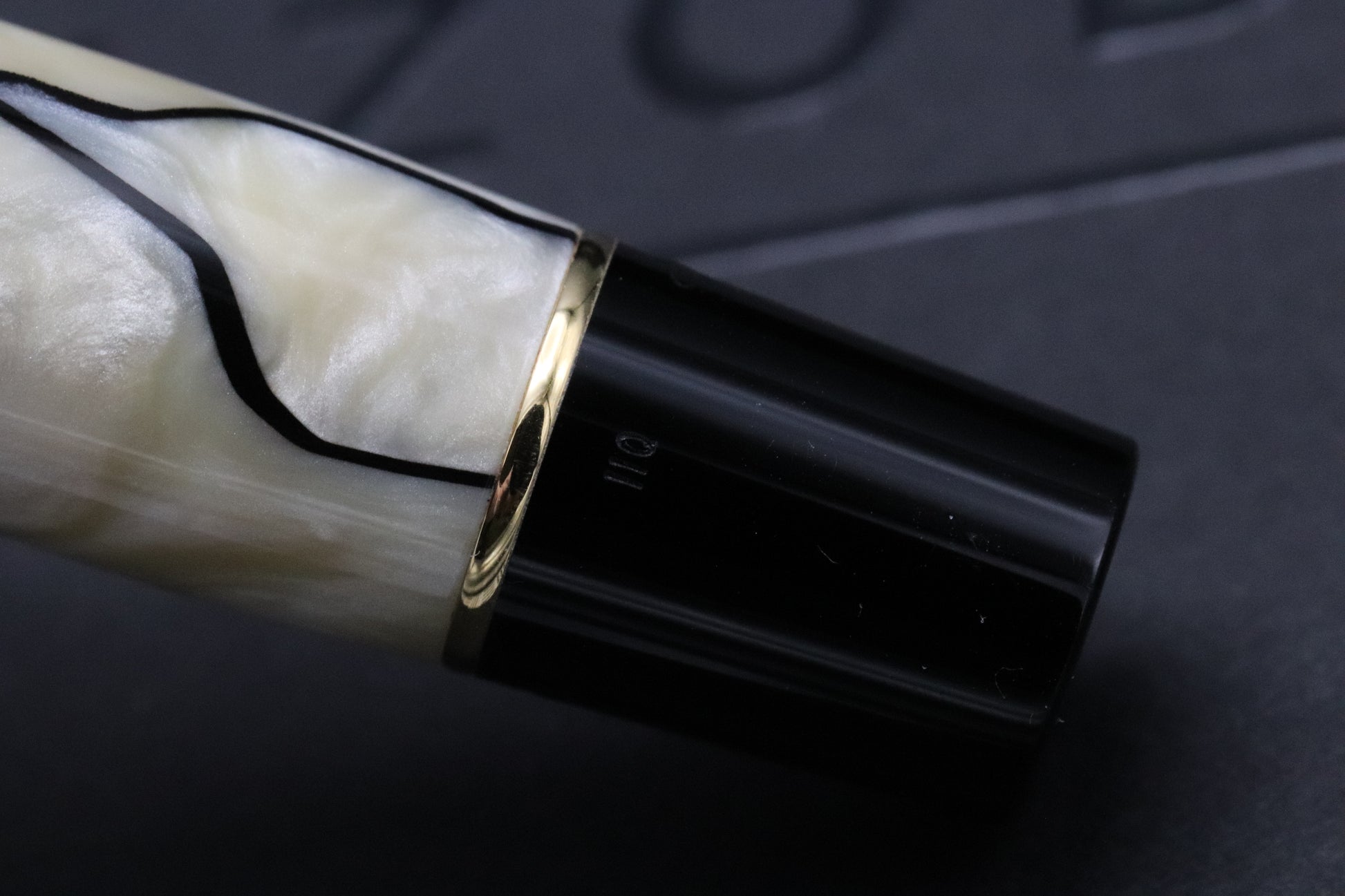 The pen is crafted from glorious pearl and black resin, which has myriad of shimmering tones. The trim is gold-plated.