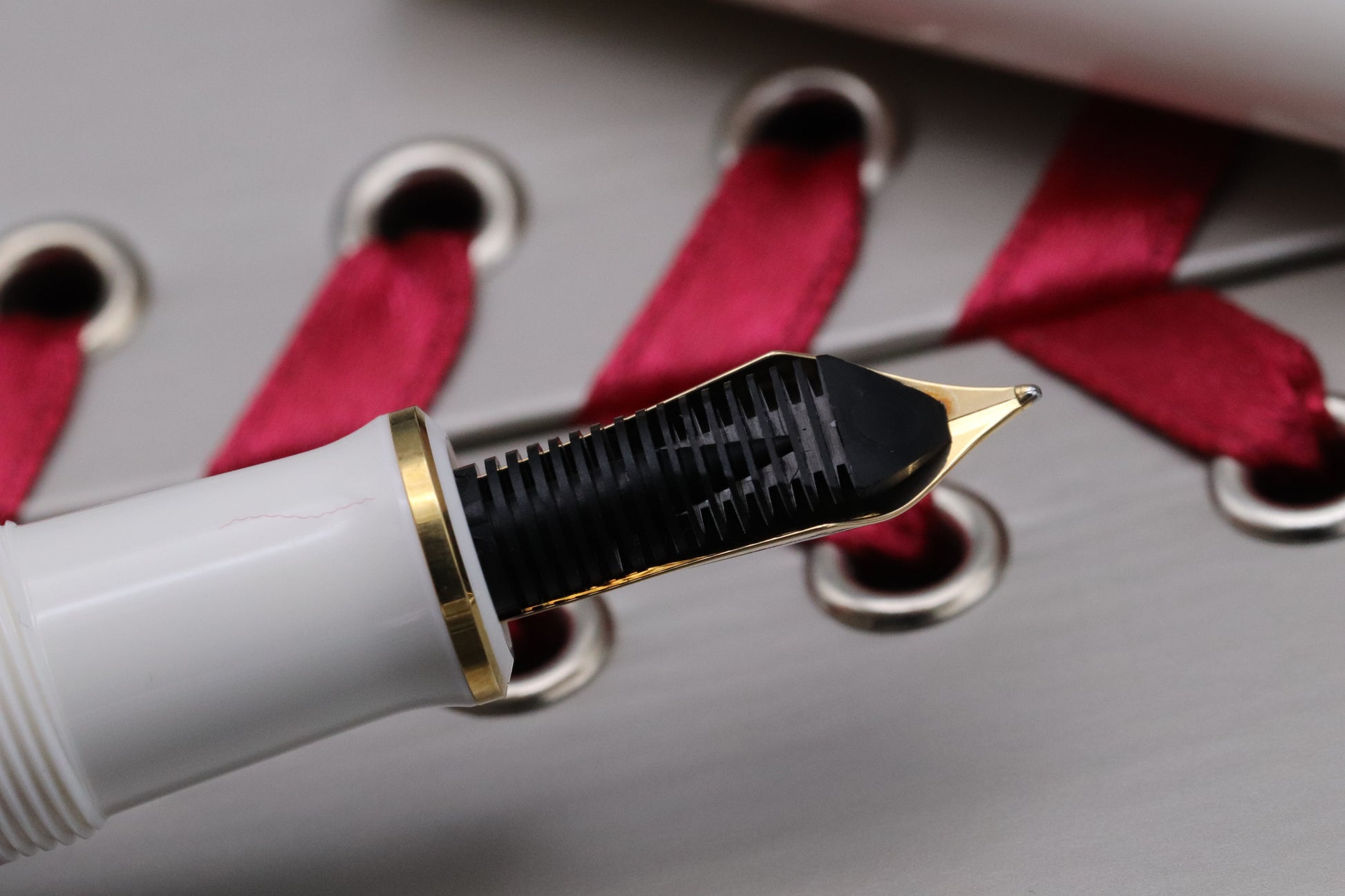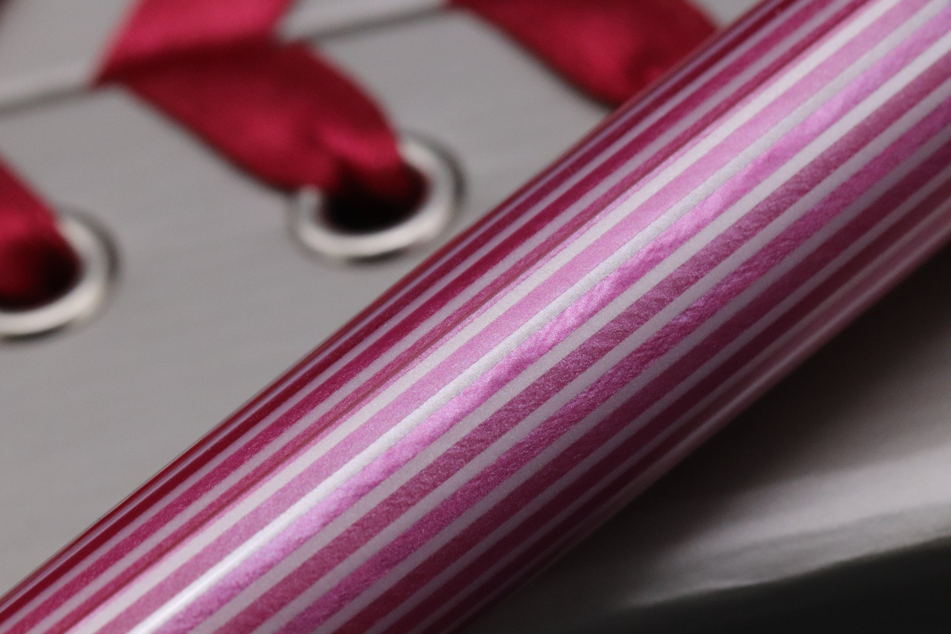 Released in 2015, the barrel features a glorious pink striped design and the cap, cone and section are white resin. The trim is gold-plated.