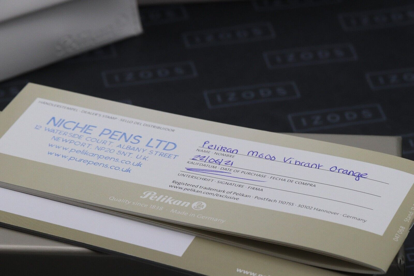 Thanks very much for looking at our listing for this Pelikan Souveran M600 Vibrant Orange Fountain Pen, which comes with its Pelikan presentation box (including outer) and stamped booklet - confirming first purchase on 22nd June 2021. The pen has barely been used and is presented in fantastic condition.