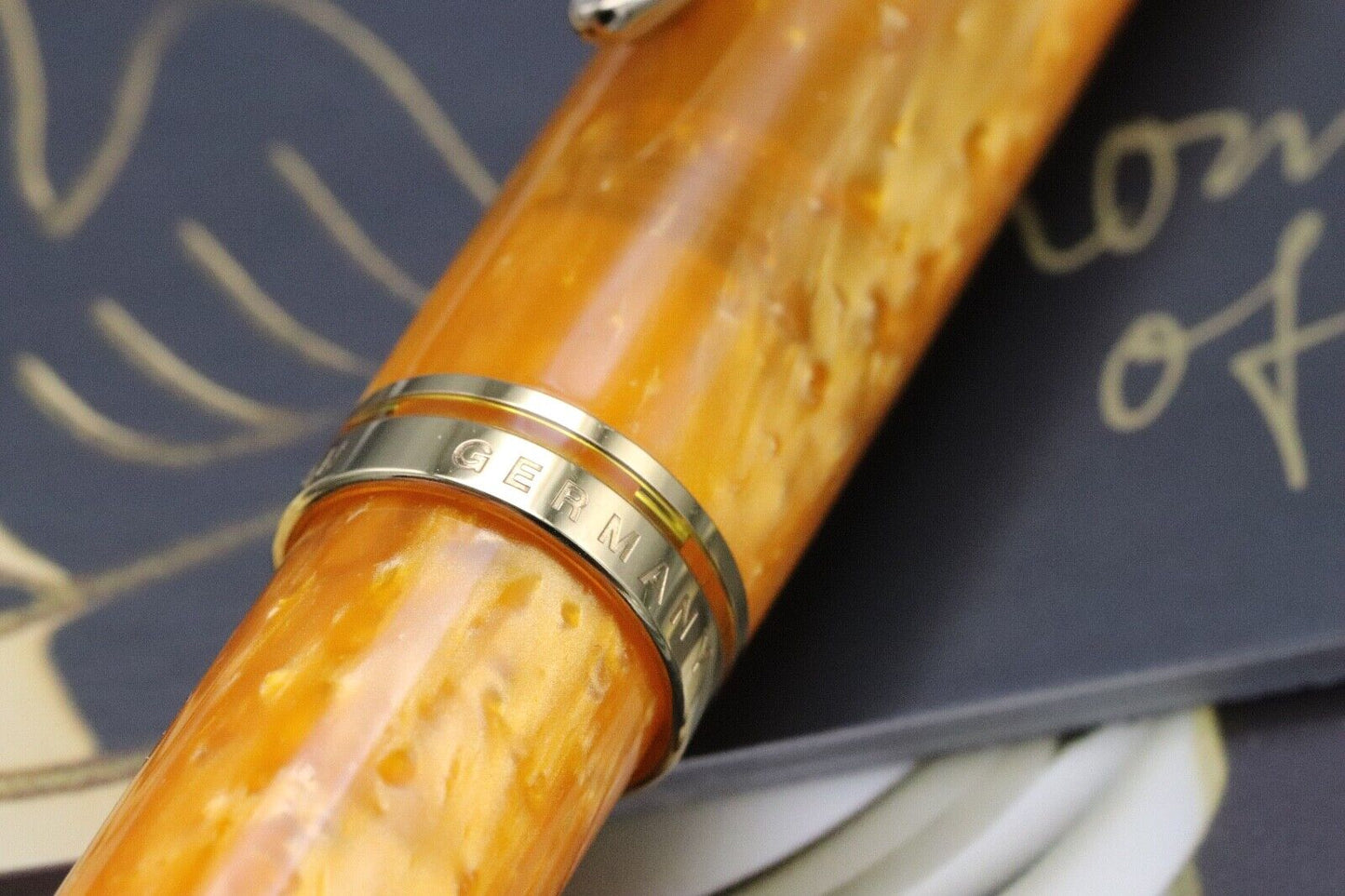Released as a special edition in 2018, the pen is crafted from a shimmering pearlised orange resin, with the trim being gold-plated.
