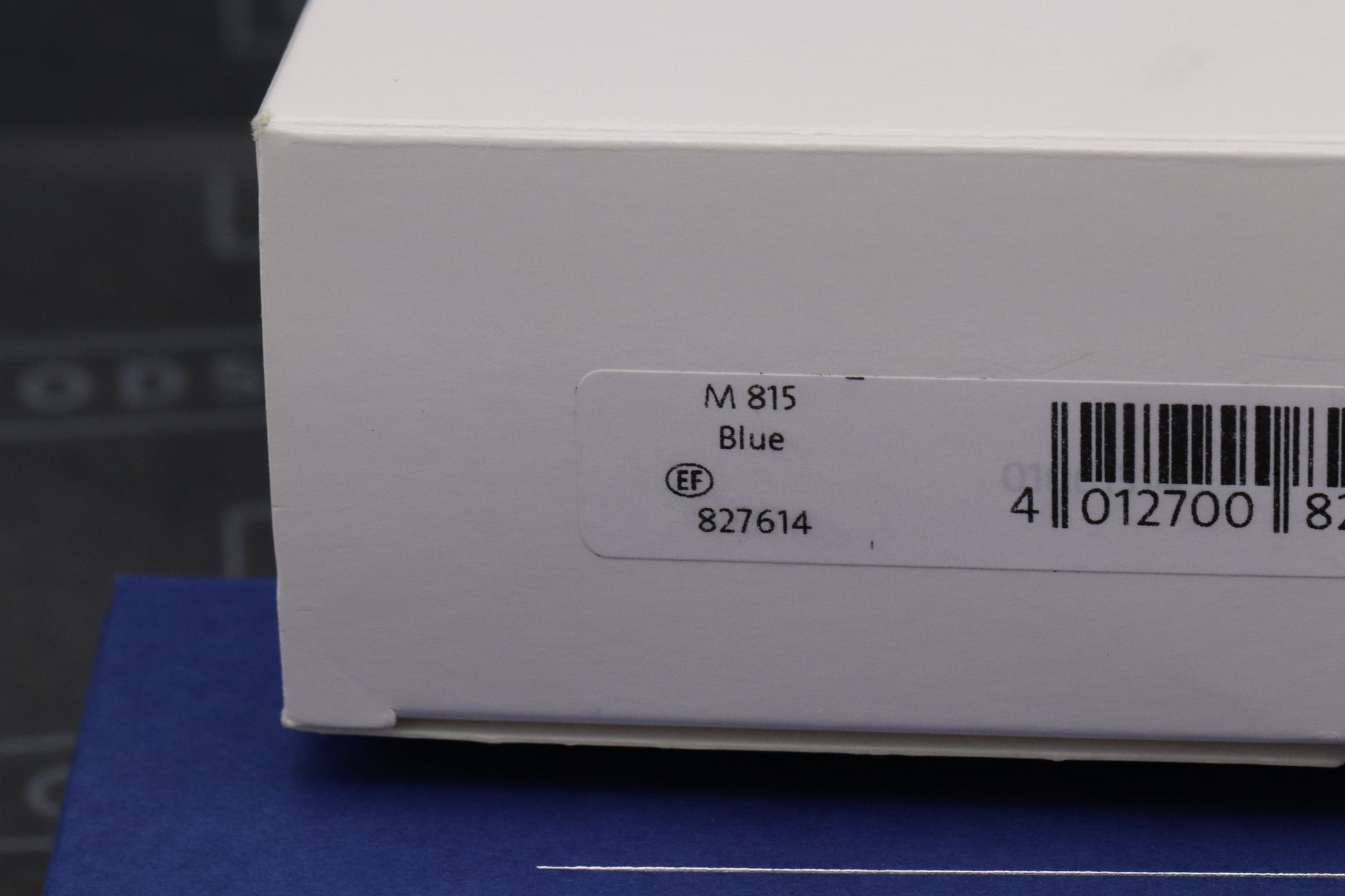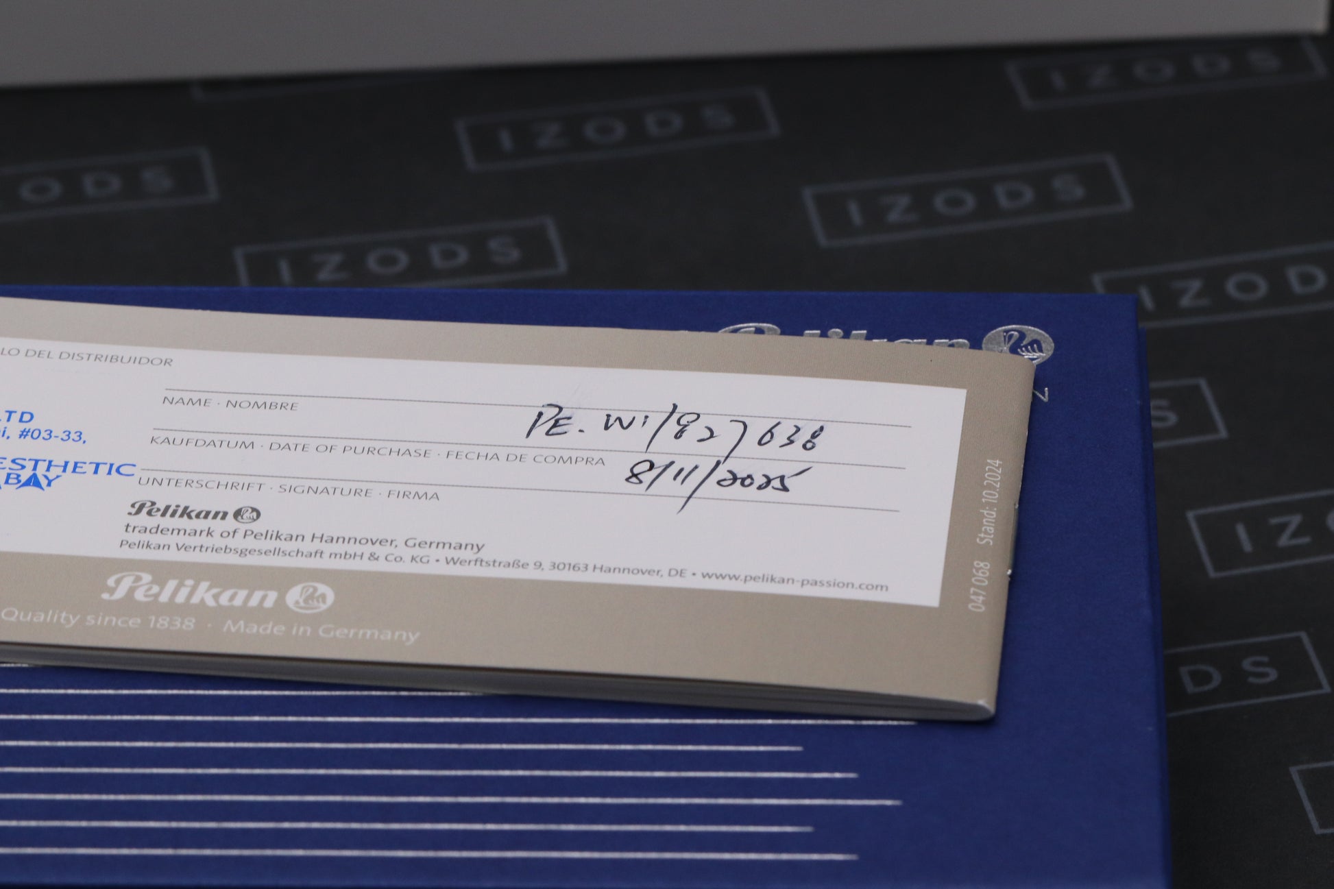 Thanks very much for looking at our listing for this Pelikan Souveran M815 Metal Striped Blue Fountain Pen, which comes with its Pelikan presentation box and stamped booklet - confirming first purchase on 8th Novemeber 2025. The pen has barely been used and is presented in wonderful condition.