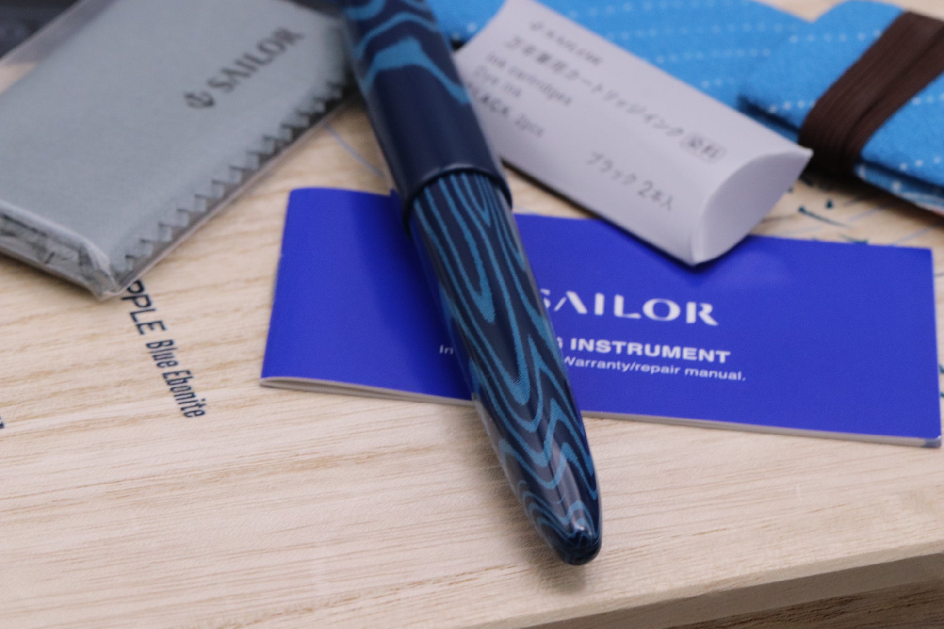 Thanks very much for looking at our listing for this Sailor King of Pen Blue Ripple Ebonite LE88 Fountain Pen, which comes with its wooden Sailor presentation box (including outer), polishing cloth, pen kimono and information leaflets. The pen has barely been used and is presented in fantastic condition.